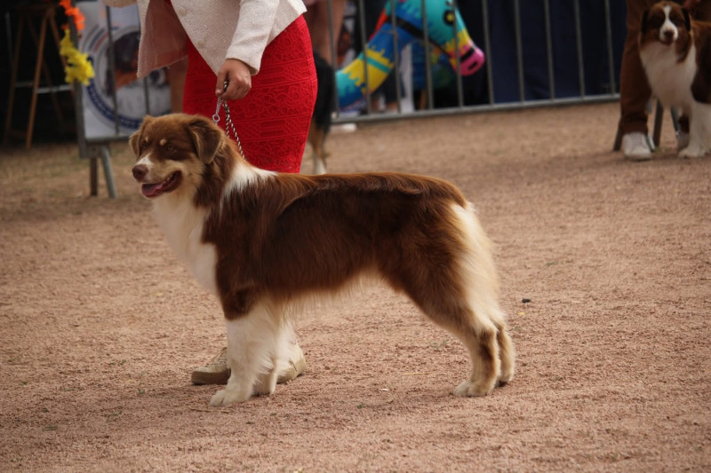 Mâle harmonieux dans son type, crane puissant, le menton pourrait etre plus fort, EXC oreilles, TB encolure, TB épaule, EXC oreilles, TB encolure, TB épaule, EXC poitrail, l’angulation arrière pourrait être très légèrement plus marqué, dos légèrement remontant vers la groupe, EXC allures